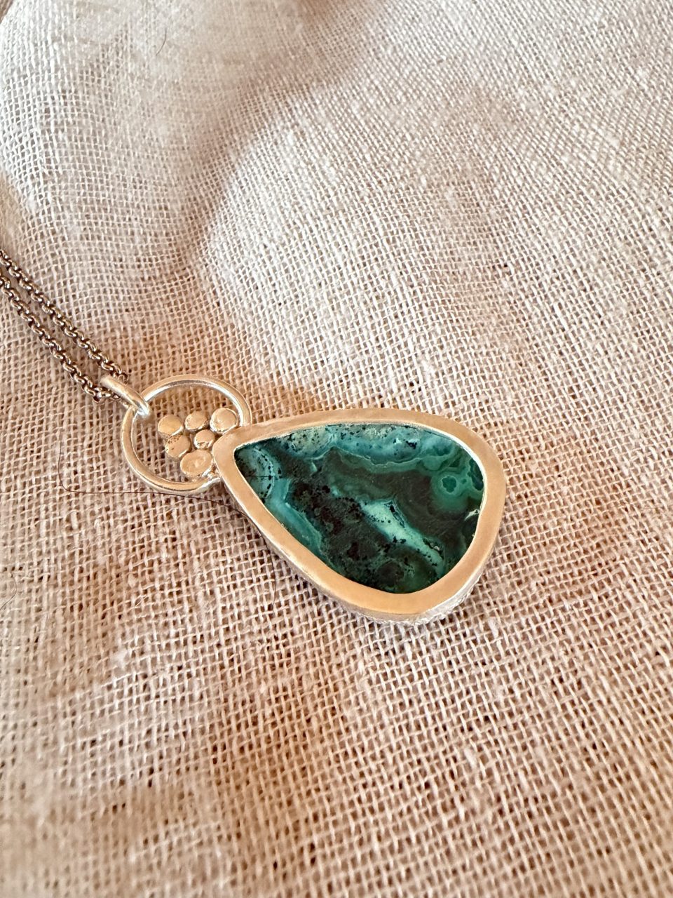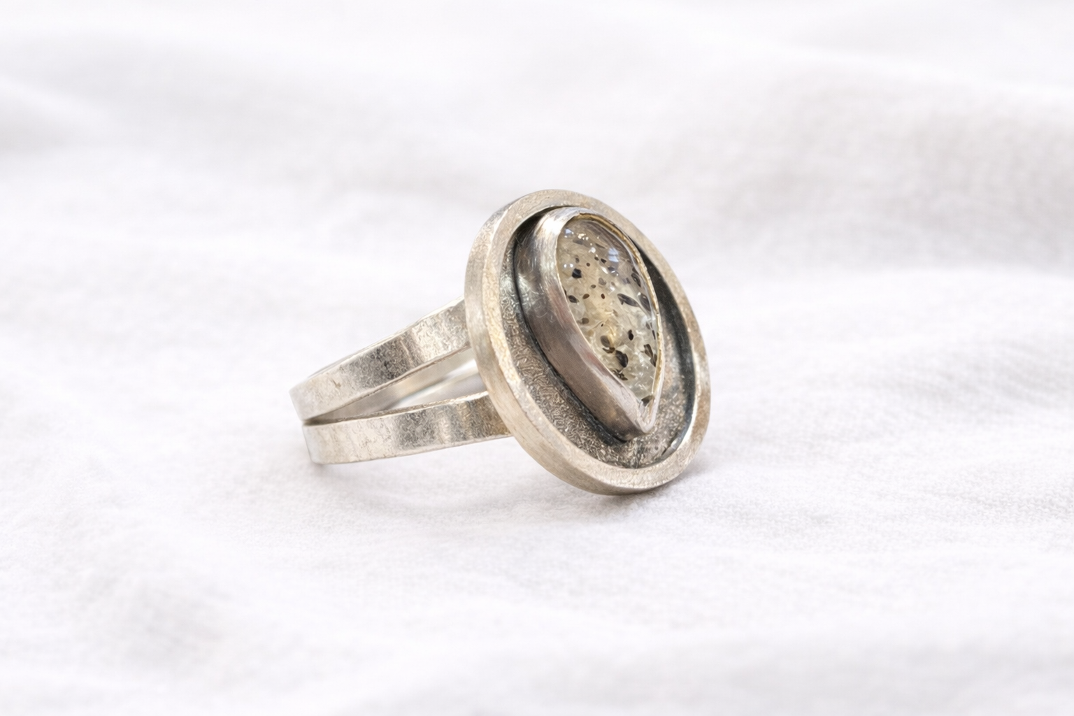 El diseño combina un engaste orgánico con una base circular en plata que aporta profundidad y contraste, creando una composición escultórica y equilibrada. El acabado mate y las texturas hechas a mano refuerzan su carácter artesanal y contemporáneo.