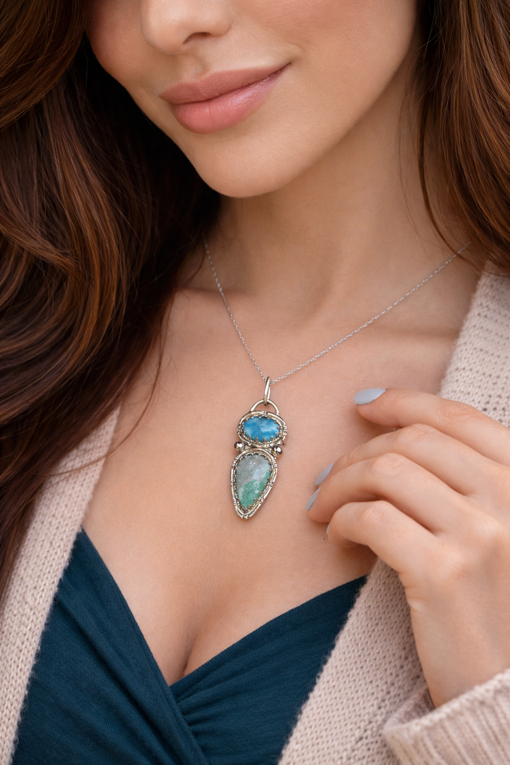 Collar artesanal de plata con larimar y variscita, dos piedras naturales que evocan calma, frescura y equilibrio. Una joya delicada y atemporal, pensada para acompañarte en el día a día.