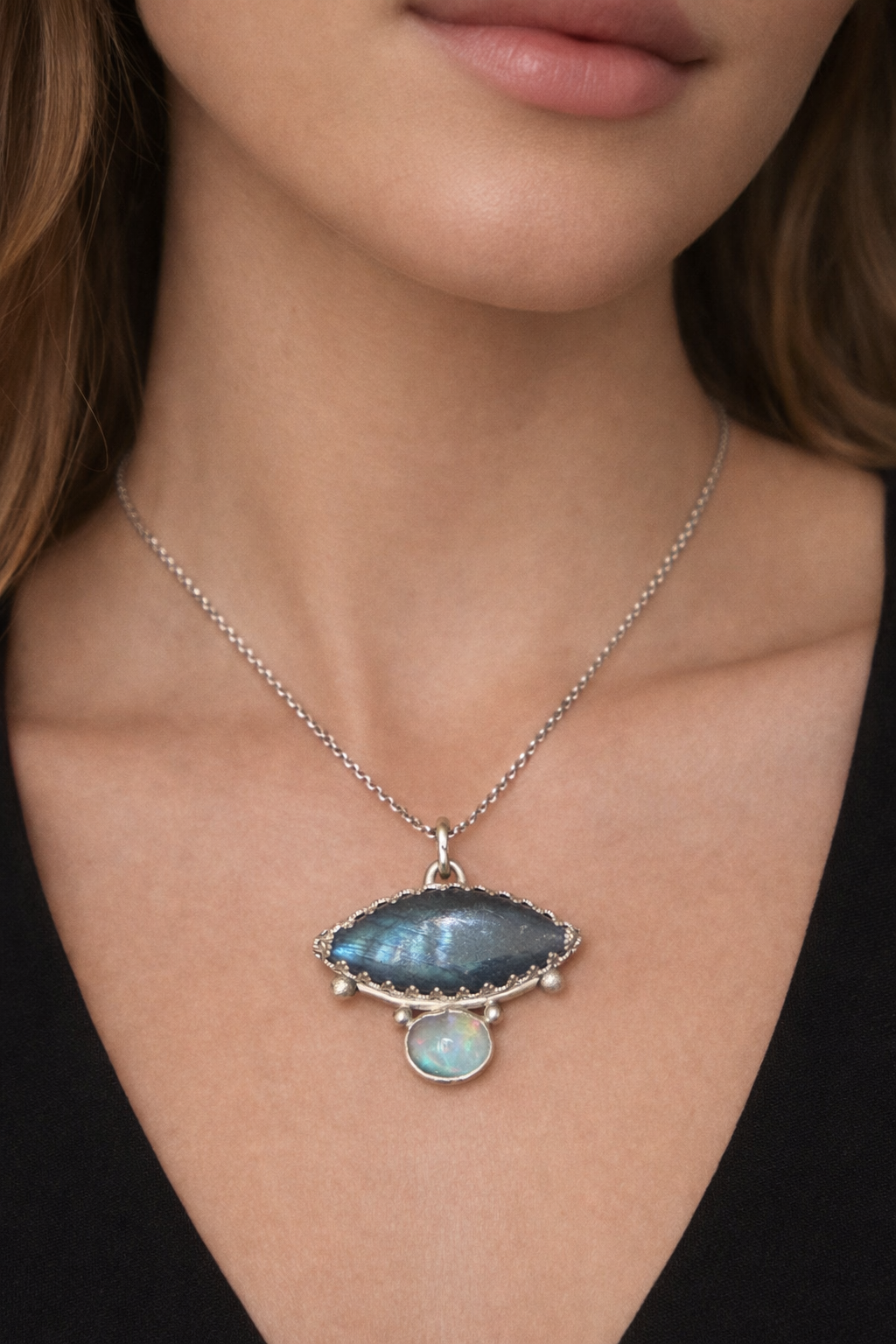 Este collar artesanal combina labradorita y ópalo etíope, dos piedras naturales conocidas por su relación con la luz, la intuición y la sensibilidad.