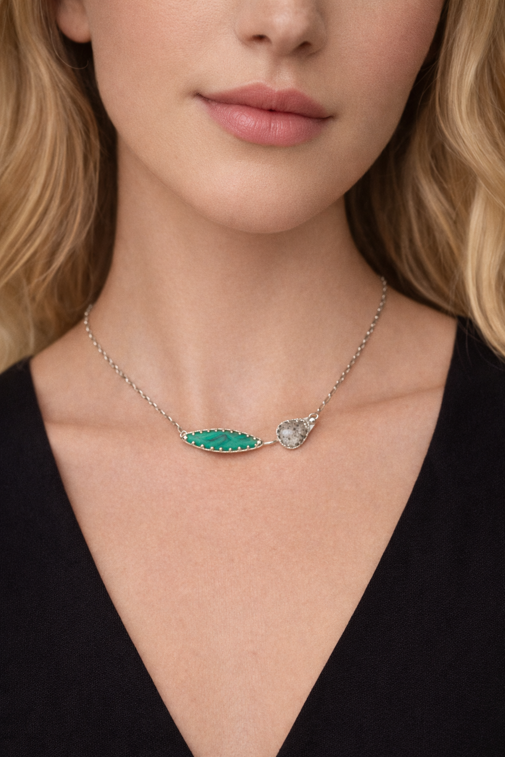 Este collar artesanal combina malaquita y cuarzo cristal, dos piedras naturales que se complementan creando una pieza llena de carácter, equilibrio y luz.