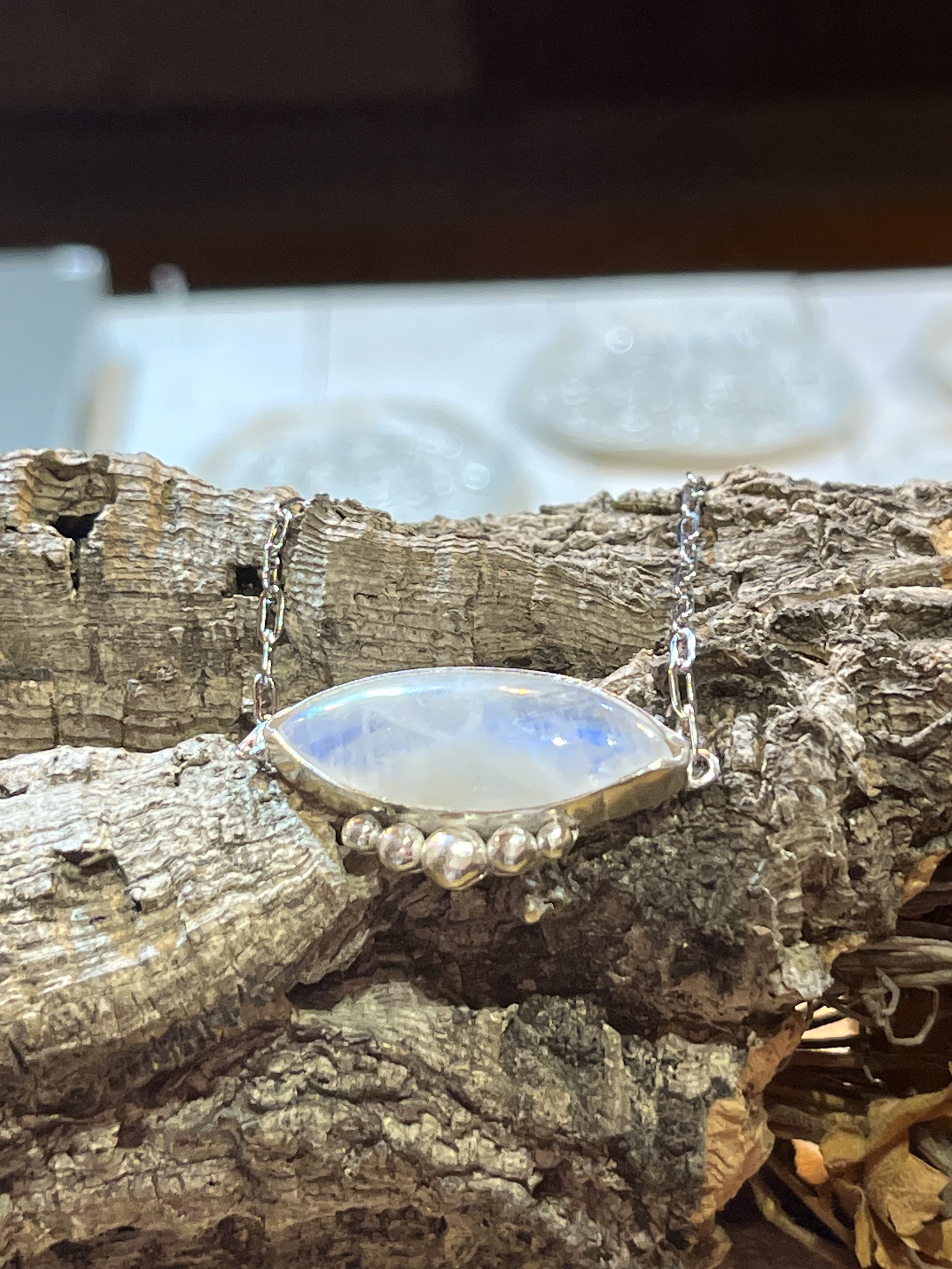 Este collar de piedra luna en plata de ley es una joya delicada y luminosa, hecha a mano con un diseño horizontal tipo navette que realza la belleza natural de la piedra. La piedra luna natural, con sus reflejos irisados azulados, aporta un brillo suave y etéreo que convierte este colgante en una pieza especial y atemporal.