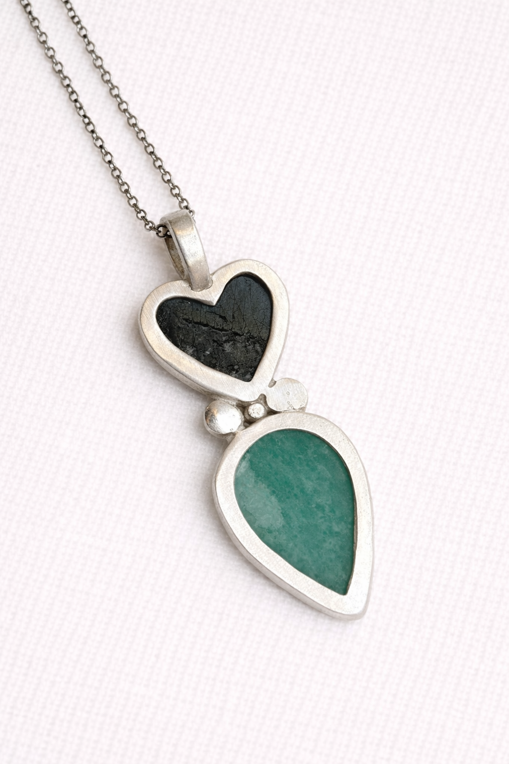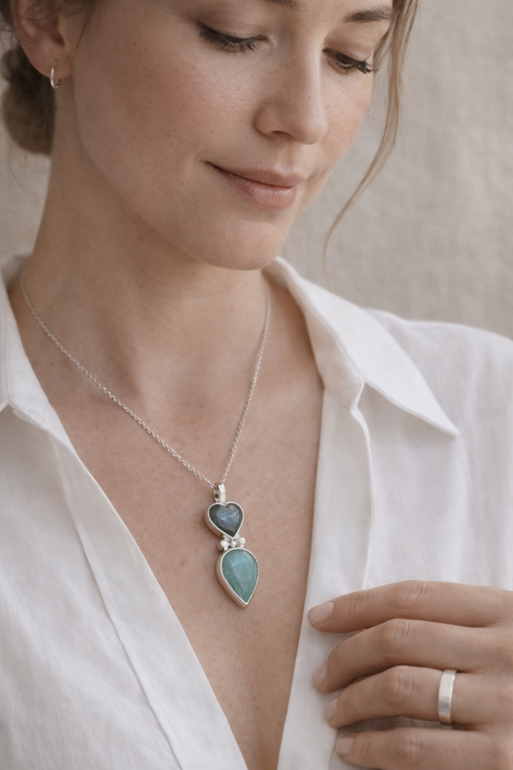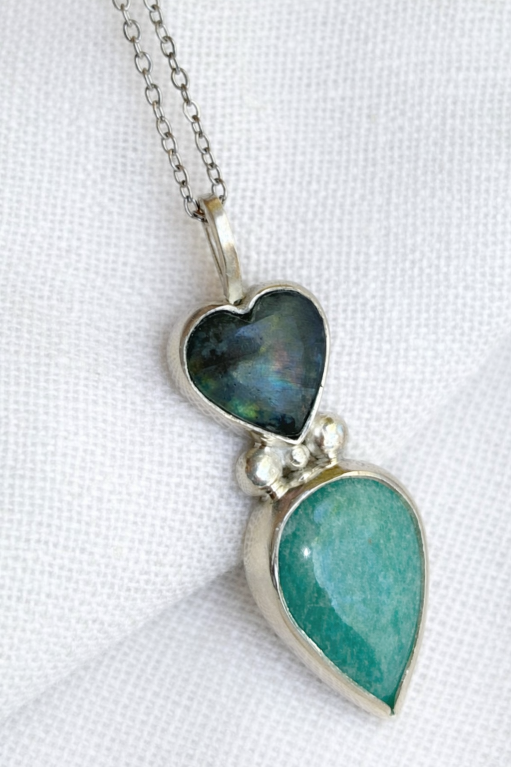 Una pieza que equilibra forma y materia con una sensibilidad serena. Este collar está compuesto por un corazón de labradorita, con sus reflejos profundos y cambiantes, unido a una lágrima de amazonita en tono verde suave, creando un diálogo sutil entre luz y calma.