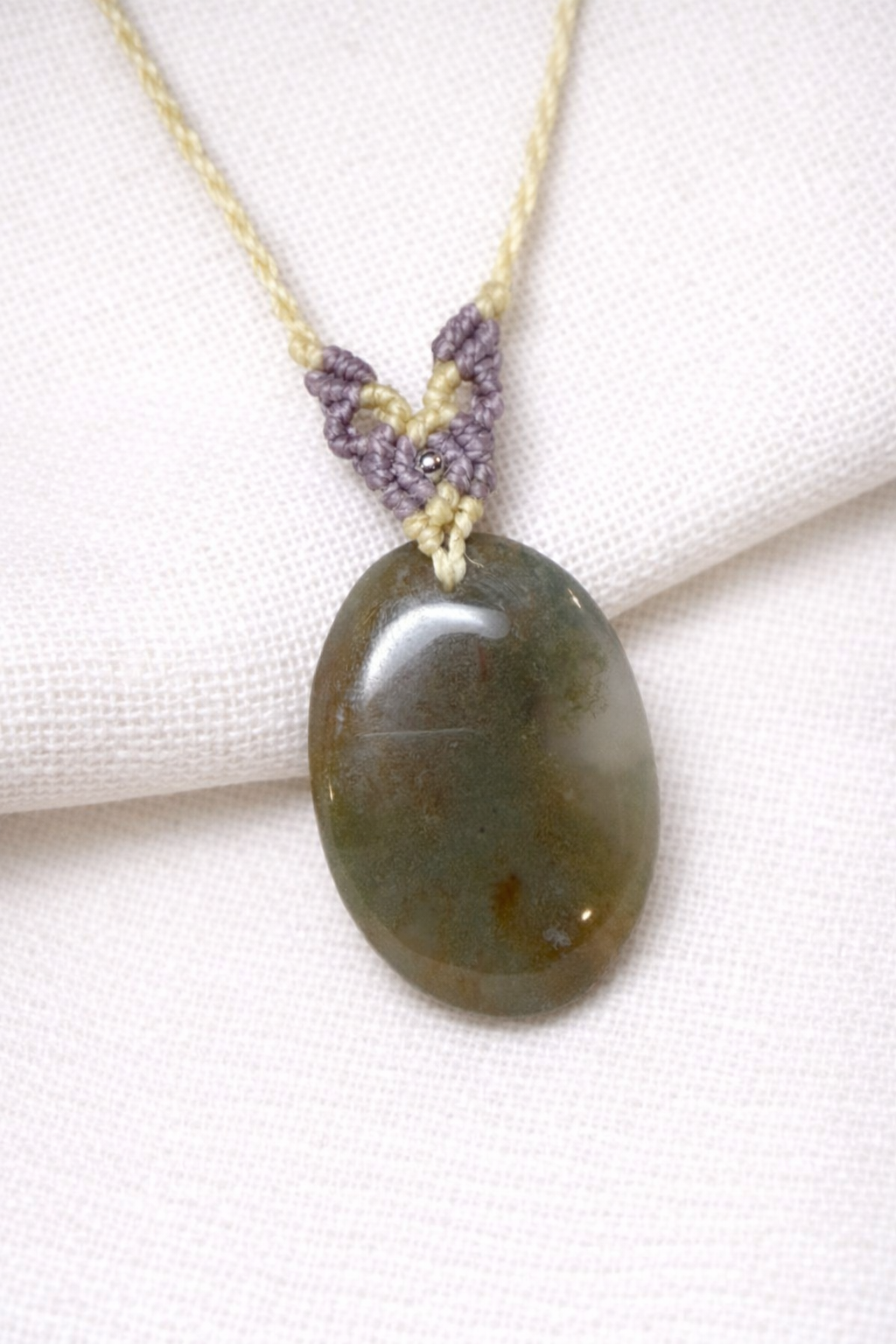 Collar de macramé tejido a mano que integra una ágata musgo natural como pieza central. La piedra presenta vetas e inclusiones verdes con formas orgánicas que evocan paisajes naturales, haciendo que cada collar sea diferente.