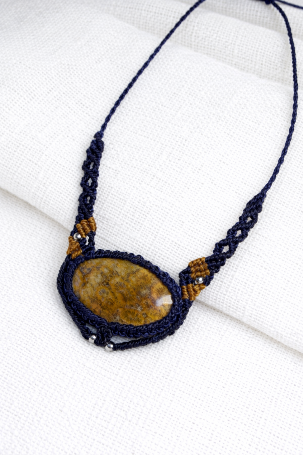 Una pieza que habla de tiempo, de materia que ha sabido transformarse sin prisa. Este collar de la colección Pausa incorpora un fósil de coral, una piedra que no se forma, sino que permanece. Cada trazo en su superficie es memoria mineral, un registro silencioso de lo que ha sido.