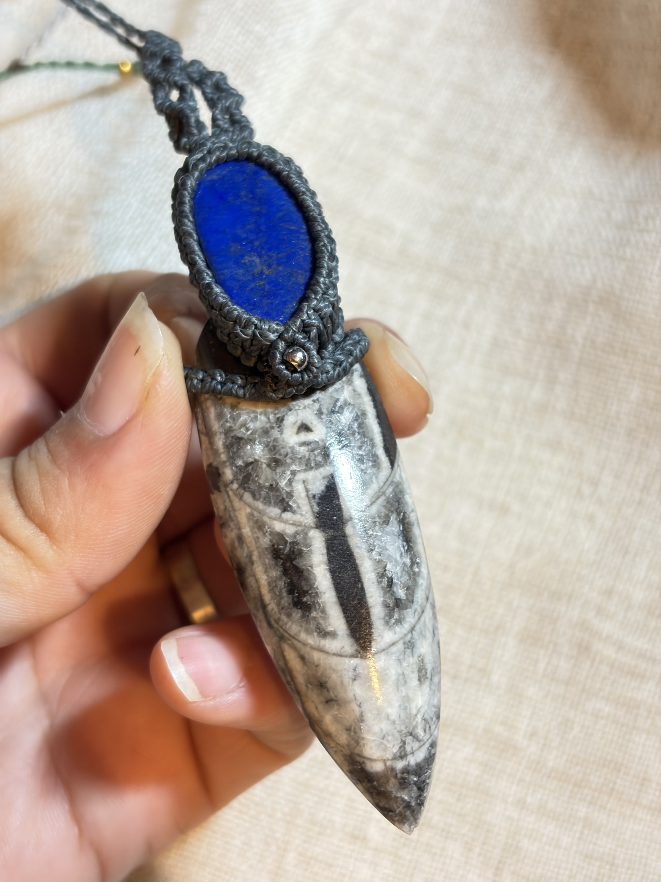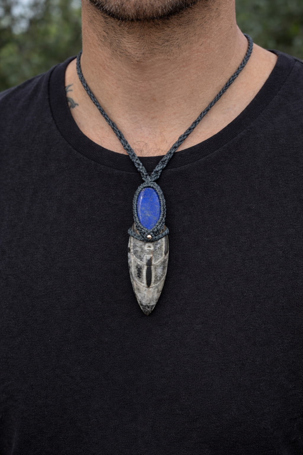 Este collar artesanal combina una ortocera fósil natural con lapislázuli, creando una pieza única que conecta el pasado más remoto de la Tierra con la profundidad del presente.
