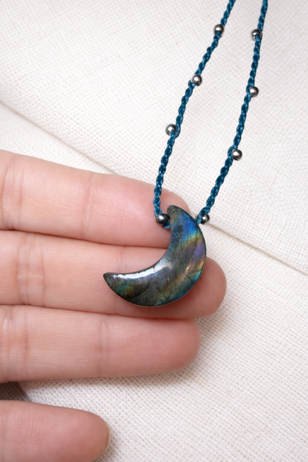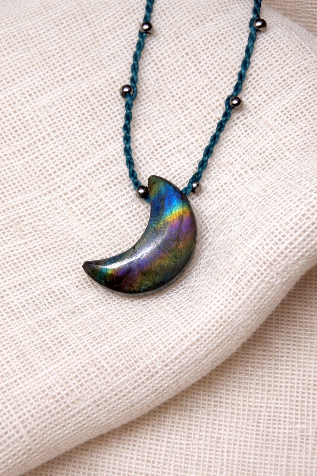 Collar de luna tallada en labradorita natural con cordón de macramé tejido a mano. Piedra pulida con reflejos iridiscentes y acabado brillante. Joyería de autor artesanal, ligera y de carácter contemporáneo.