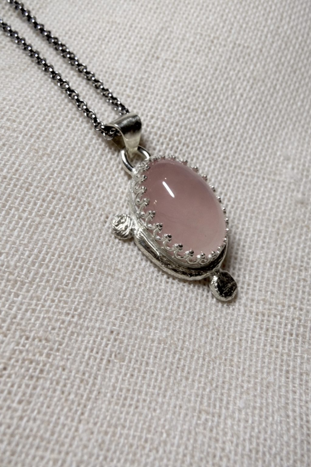 Este colgante está elaborado en plata de ley 925 y engasta un cuarzo rosa natural de forma ovalada, pulido para realzar su suavidad y su tono rosado delicado. El diseño se completa con pequeños detalles orgánicos en plata que abrazan la piedra, aportando carácter y una sensación de amuleto atemporal.