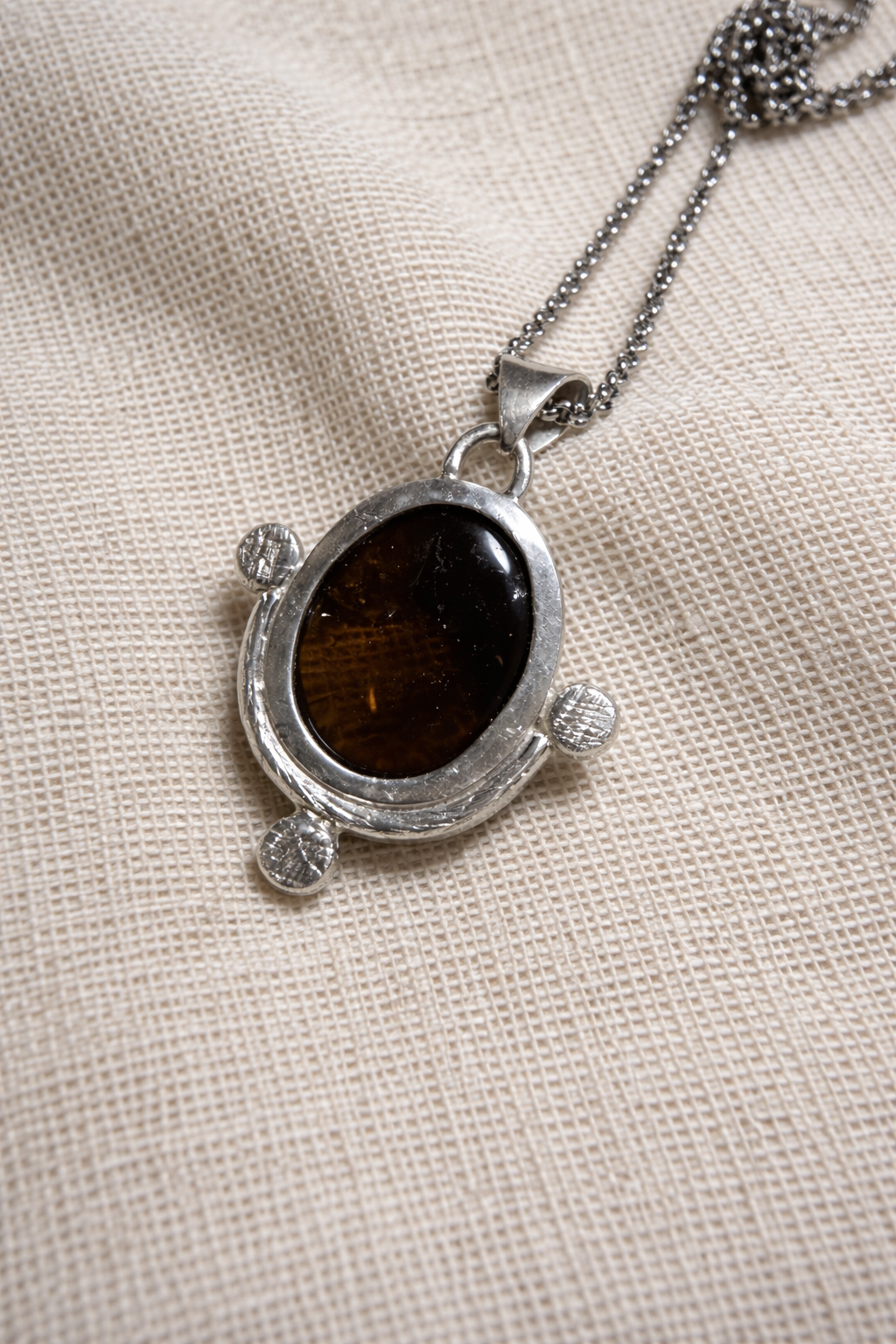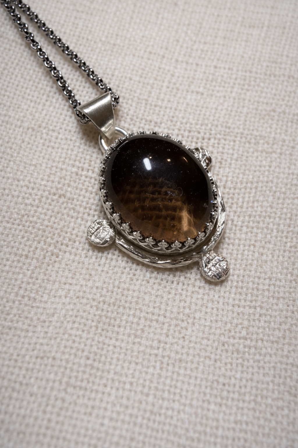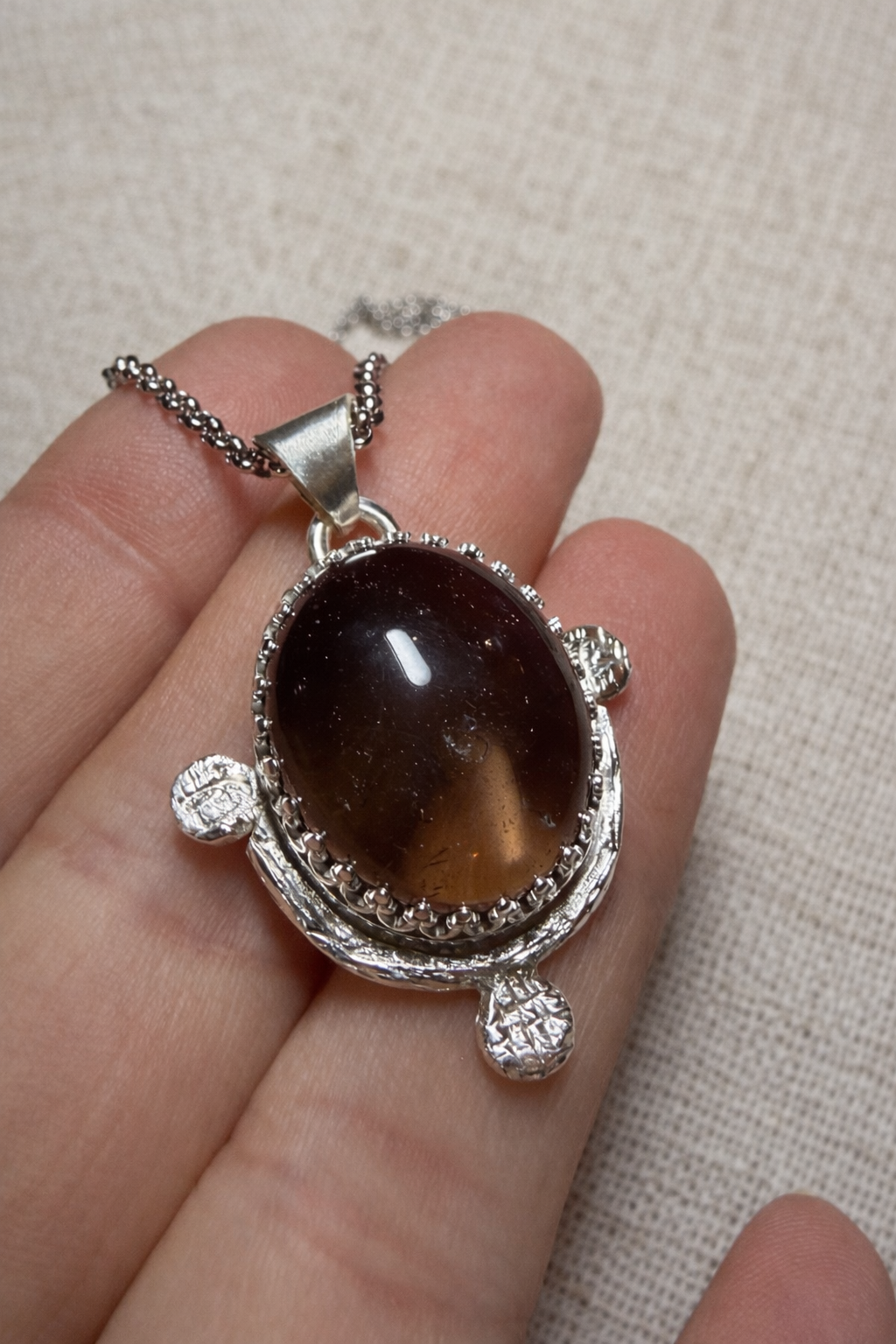 El cuarzo ahumado es una piedra asociada a la protección energética y la liberación de tensiones, ayudando a anclar la energía y aportar serenidad en momentos de cambio. Su tono cálido contrasta con la textura orgánica de la plata, dando lugar a una joya con carácter, profundidad y presencia.