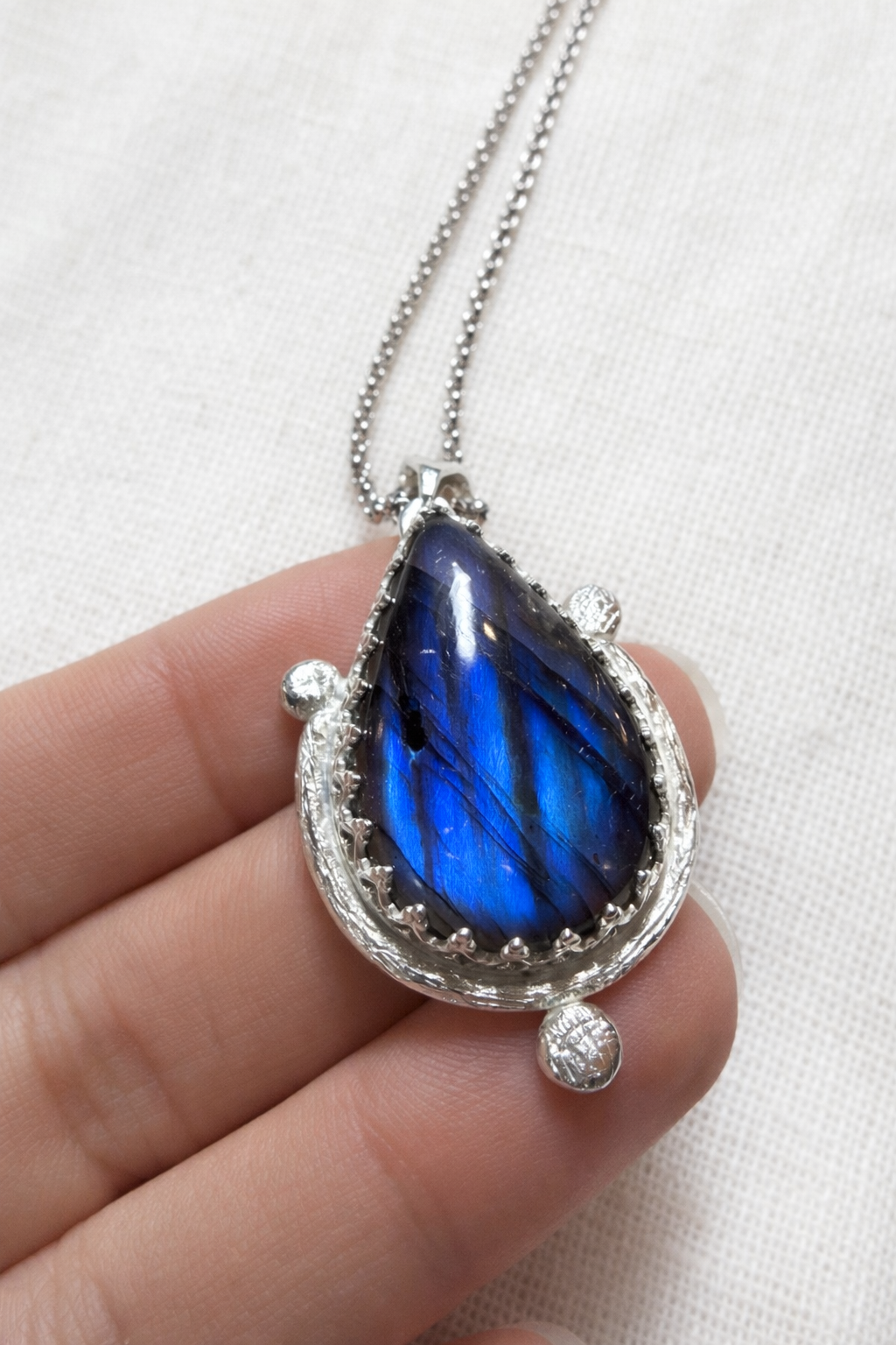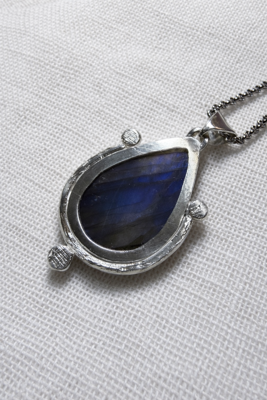 Este collar Ofrenda con labradorita natural está realizado a mano en plata de ley, respetando la forma orgánica de la piedra y su luz cambiante. Cada pieza es única: la labradorita muestra destellos azules intensos que aparecen y desaparecen según la luz, como si guardara un secreto en su interior.
