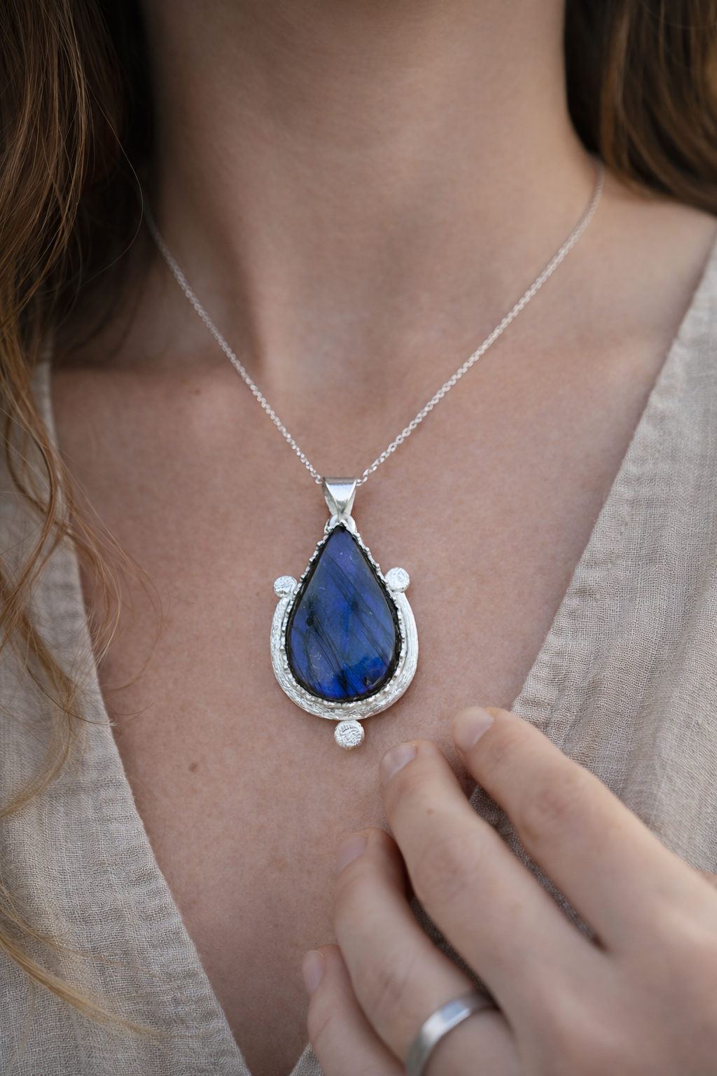 La piedra está engastada de manera artesanal, con una montura irregular que abraza la labradorita sin ocultarla, dejando ver sus vetas y reflejos naturales. Los pequeños volúmenes de plata que la rodean aportan carácter y equilibrio, reforzando la sensación de amuleto contemporáneo.