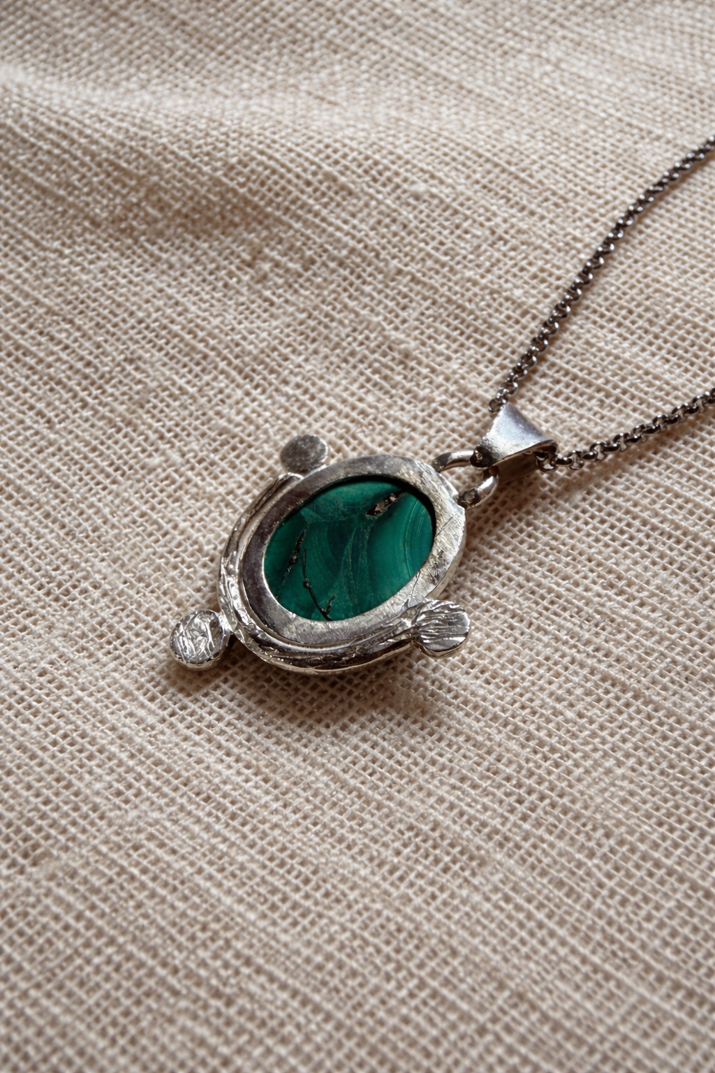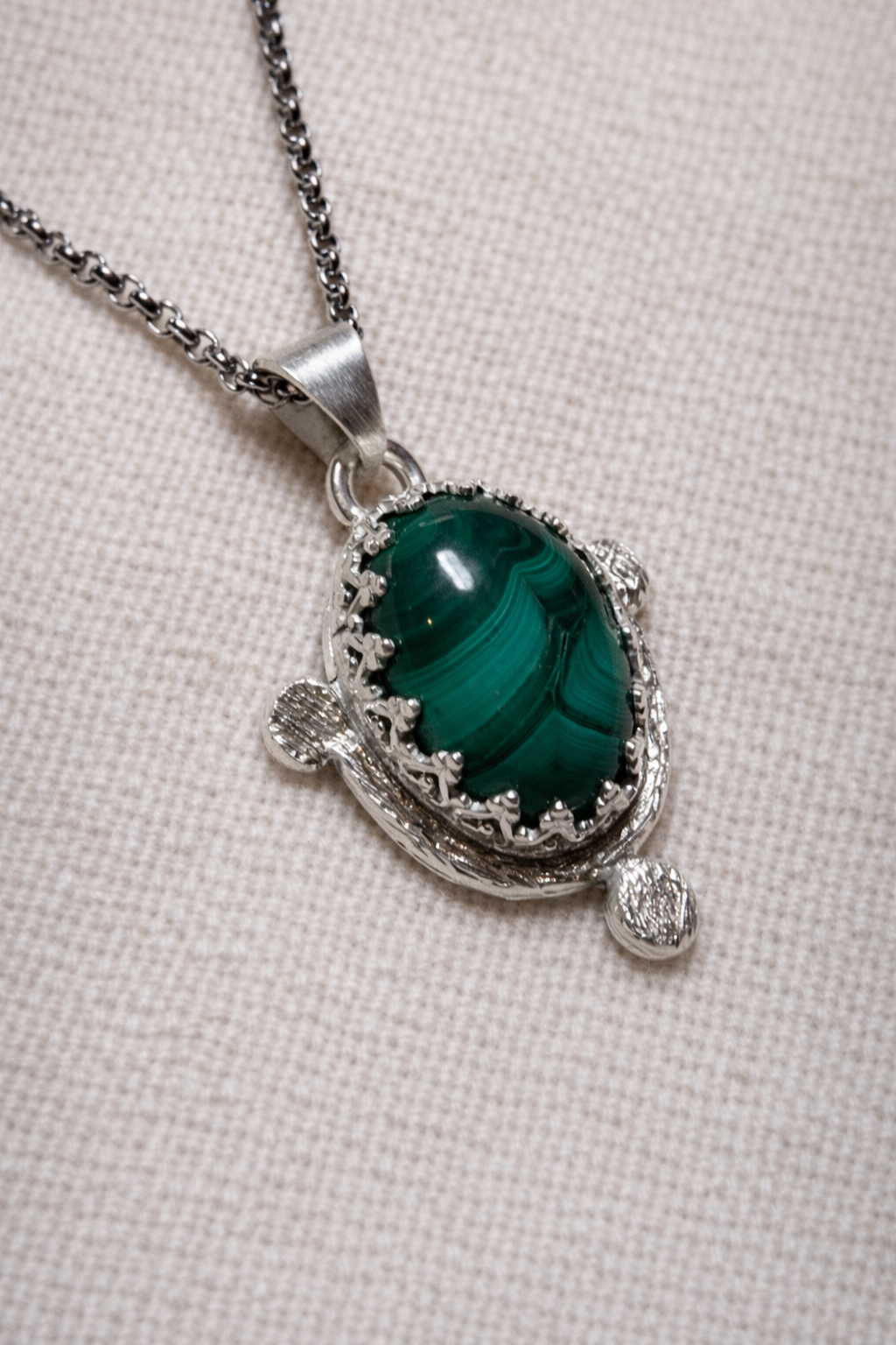El collar Ofrenda con malaquita es una joya única, creada como un gesto de respeto, protección y conexión con la tierra. Cada pieza está elaborada de manera artesanal en plata de ley, abrazando una malaquita natural de intenso color verde, con vetas orgánicas irrepetibles que hacen que no existan dos collares iguales.
