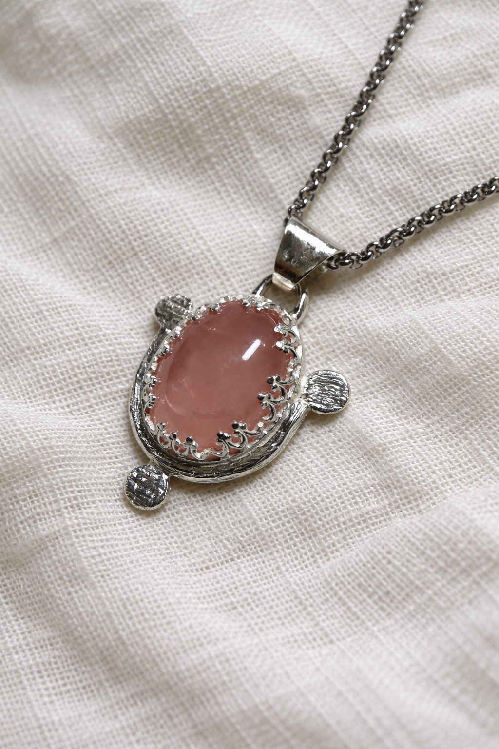 El cuarzo rosa natural, con su tono delicado y lechoso, aporta calma y presencia. Cada piedra es única, con vetas y matices propios que hacen que no existan dos colgantes iguales. Está engarzado a mano en plata de ley 925, respetando su forma orgánica y realzando la belleza natural del mineral.