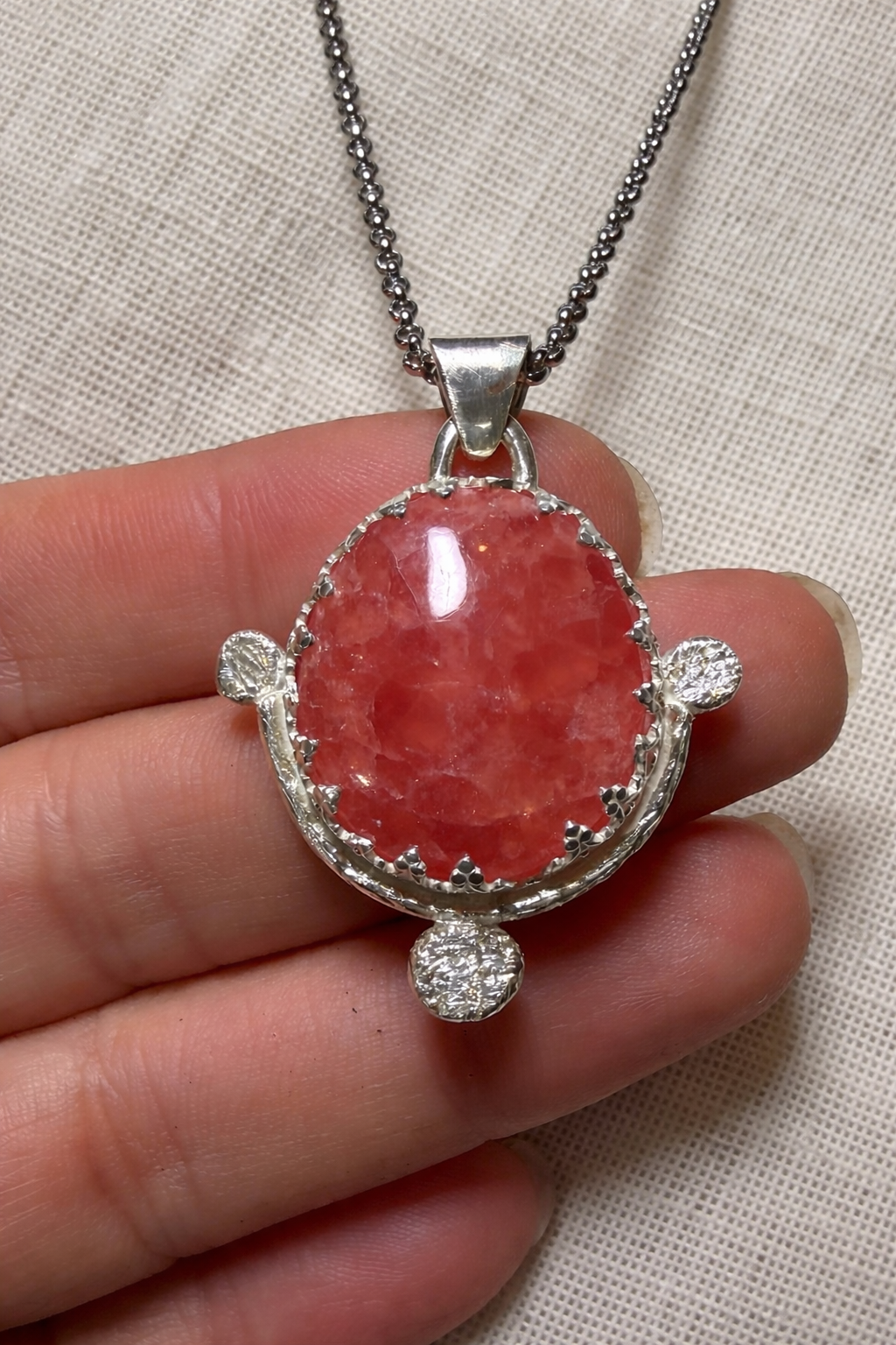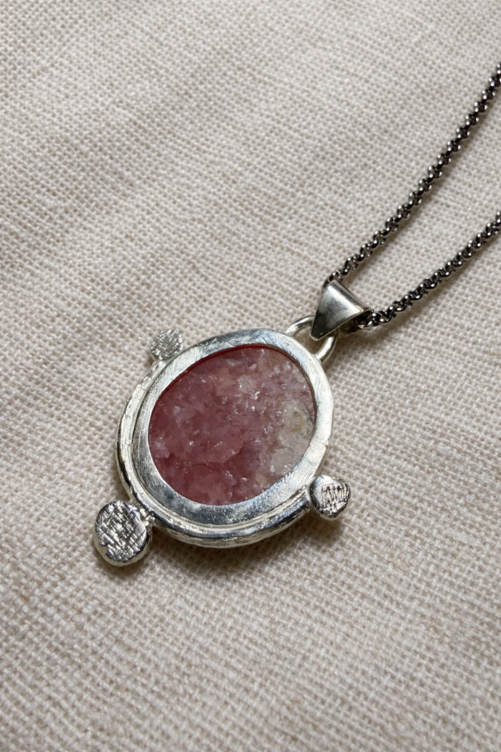 El collar Ofrenda de rodocrosita es una joya artesanal creada para honrar lo esencial: el amor, la emoción y la belleza de lo imperfecto. Cada pieza está elaborada a mano en plata de ley, respetando la forma natural de la piedra y convirtiéndola en el verdadero centro del diseño.