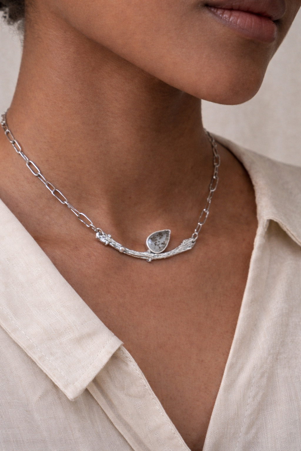 El Collar Savia con cuarzo con inclusiones es una joya que habla de lo esencial, de lo que crece lento y deja huella. Una pieza que nace de la plata trabajada con textura orgánica, como una rama viva, y se acompaña de un cuarzo único, con inclusiones naturales que dibujan paisajes irrepetibles en su interior.