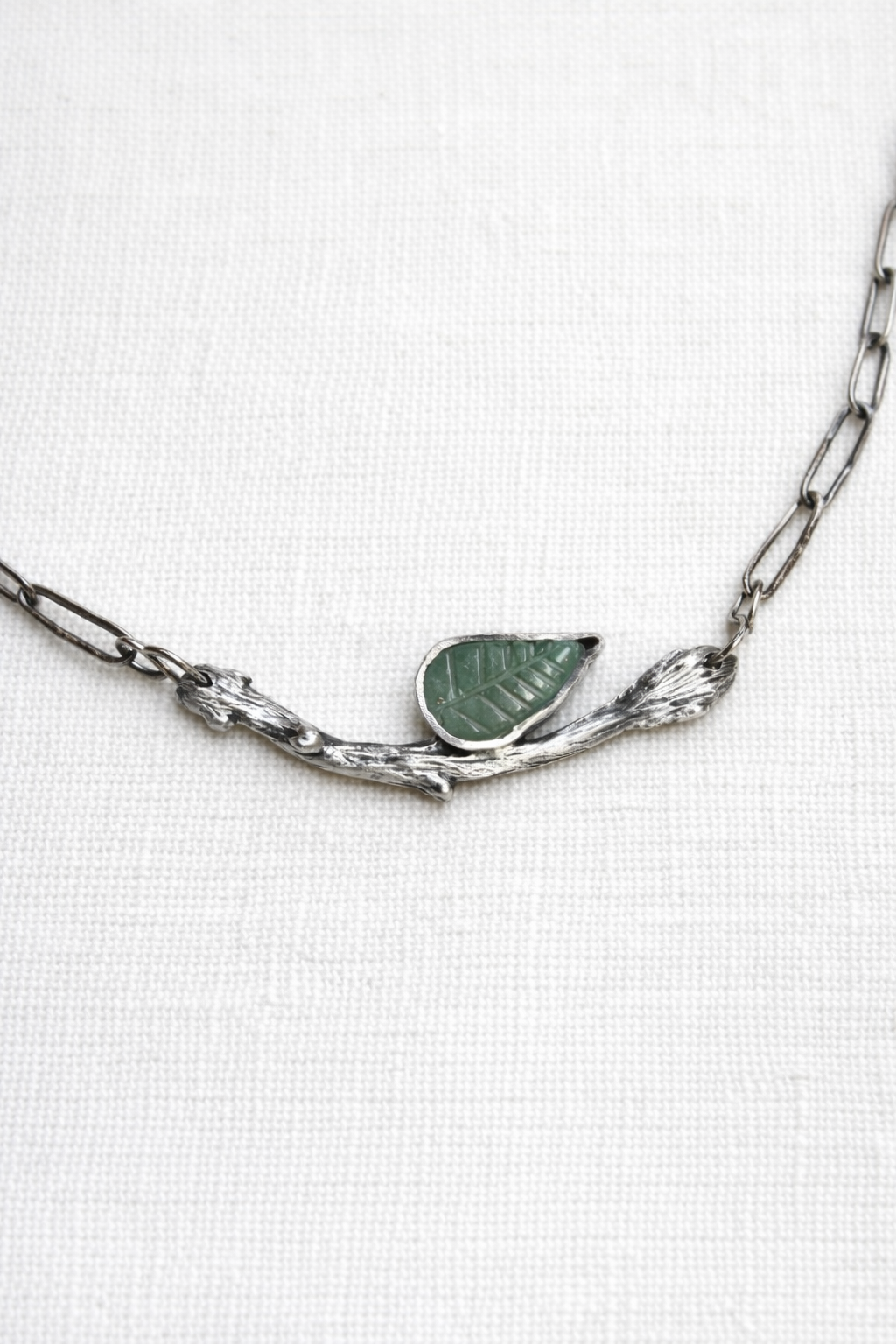 Este collar Savia con hoja de esmeralda africana nace de la observación de la naturaleza y del gesto lento del trabajo artesanal. Una pieza que habla de crecimiento, de raíz y de fuerza interior.