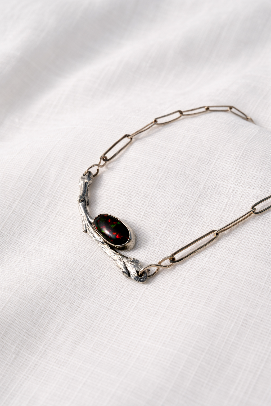 La pieza central, inspirada en la forma orgánica de una rama, está realizada en plata de ley con acabado ligeramente oxidado, respetando las texturas naturales y el carácter imperfecto de la materia. En el centro, un ópalo etíope negro de pequeño tamaño pero gran intensidad, con destellos rojos y verdes que cambian según la luz y el movimiento.