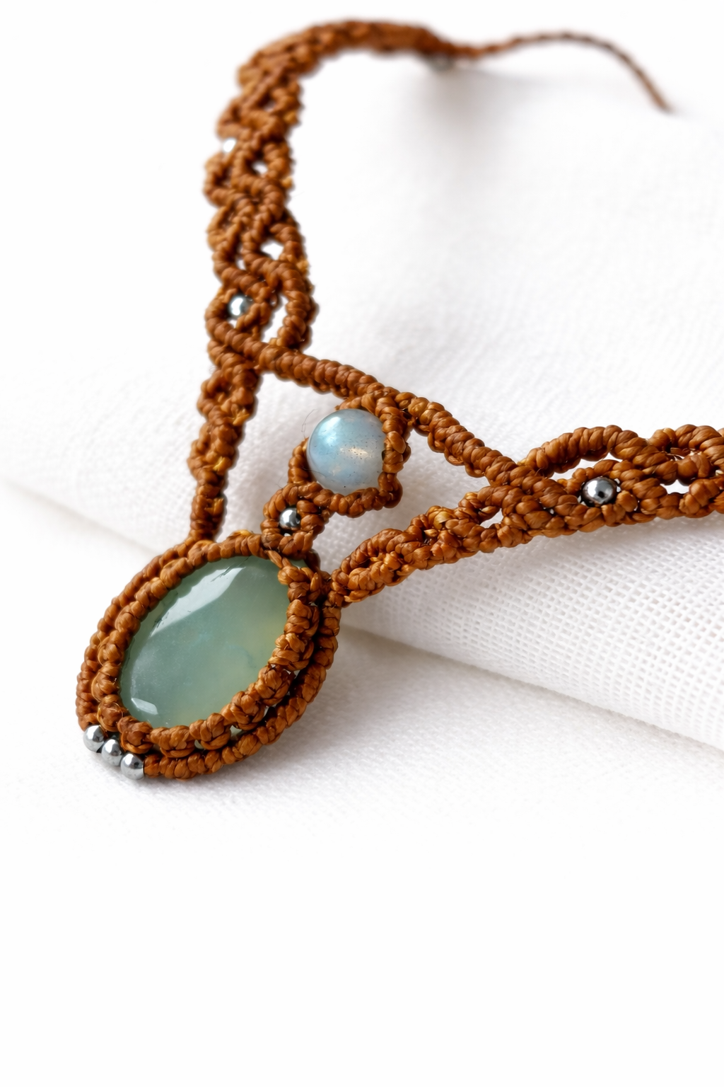 Gargantilla de macramé con crisoprasa natural, tejida a mano y diseñada para un uso cotidiano con carácter y ligereza.