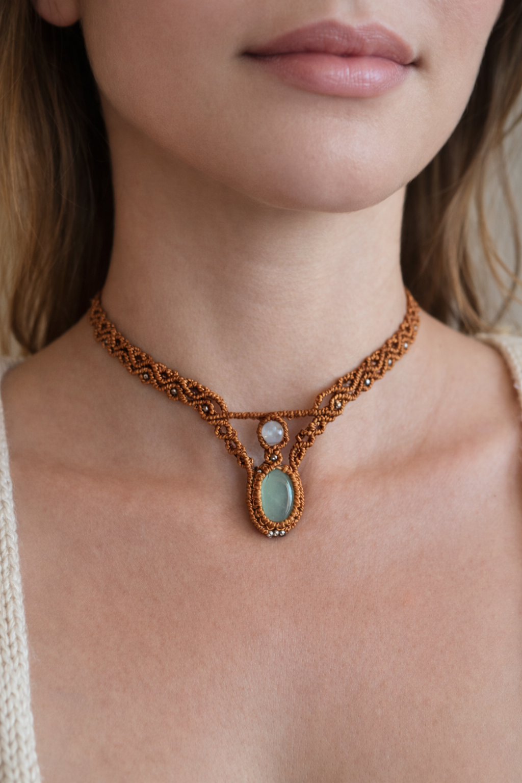 Gargantilla de macramé con crisoprasa natural, tejida a mano mediante un trabajo minucioso que envuelve la piedra y define su presencia con equilibrio y precisión. El tono verde suave de la crisoprasa introduce un matiz fresco y sereno, en contraste con la estructura del tejido, creando una pieza que destaca sin necesidad de exceso.