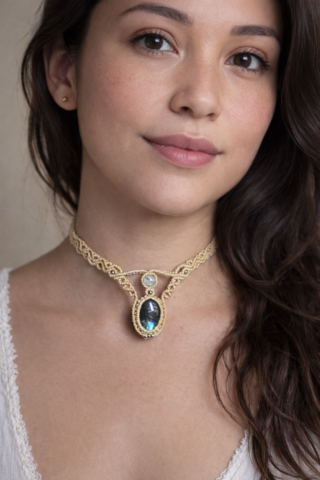 Gargantilla de macramé con labradorita natural, tejida a mano mediante un trabajo preciso que envuelve la piedra y resalta su profundidad. La labradorita presenta reflejos iridiscentes en tonos azules y verdes que aparecen con la luz, aportando una presencia cambiante y contenida.