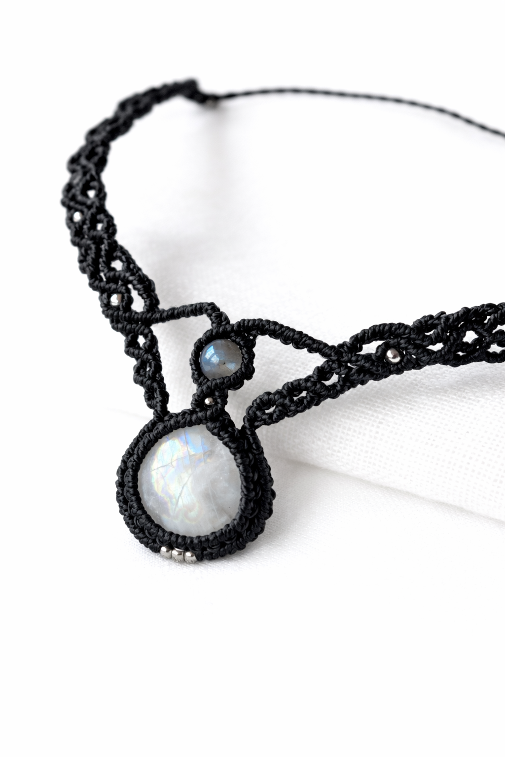 Gargantilla de macramé con piedra luna natural, tejida a mano mediante un trabajo delicado que envuelve la piedra y acompaña su forma sin imponerse. La superficie de la piedra revela reflejos nacarados que cambian con la luz, aportando una presencia sutil y viva.