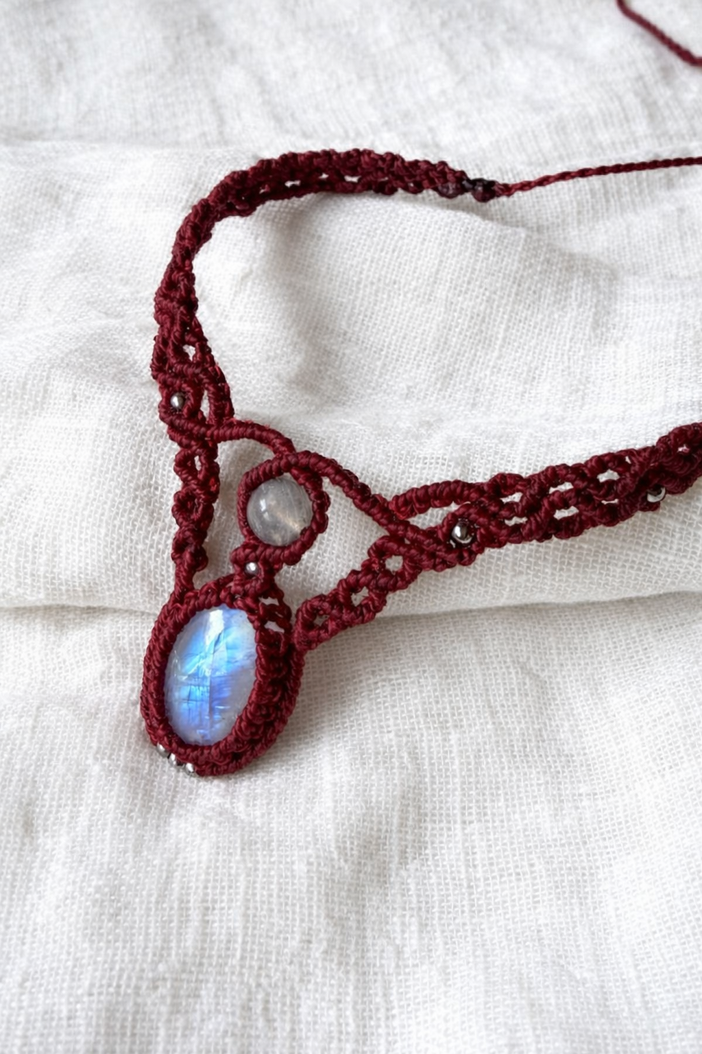 Gargantilla de macramé con piedra luna, elaborada a mano mediante una estructura de nudos precisos que envuelven la pieza sin restarle protagonismo. El hilo, resistente y ligero, se adapta al cuello con naturalidad, creando una joya de escala contenida y uso cotidiano.